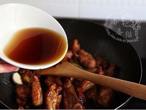 加少许料酒,再放入冰糖。