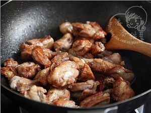 放入焯好的排骨翻炒,这时会听到排骨中的水分滋滋做响,不停翻炒,待水分煸的基本上干了,排骨表面开始微微发黄、出油。