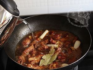 翻炒片刻待上色均匀后加入没过排骨的足量的开水,记住一定是开水,大火煮十分钟左右加盖中小火炖煮40分钟。