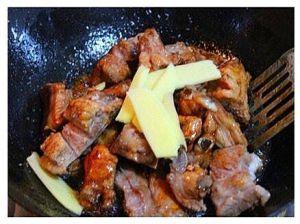 将排骨倒入锅内,转中火,快速翻炒,让每块排骨都可以裹上糖色,再放入姜片继续翻炒