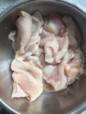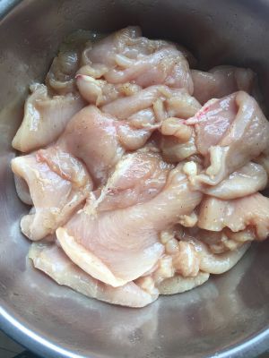 将料酒,酱油,盐,味精,葱,姜放到一起搅拌,加一个鸡蛋最好!一起搅拌,然后放将切成片的鸡胸肉(切成条也成,叫鸡柳)放到里面腌两个小时,腌过夜味道最好