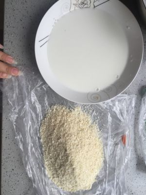 拿出已经拍平的鸡肉 先沾层面粉 再裹层鸡蛋 最后沾一层面包糠 最后一个个的放在盘子里等待下锅!