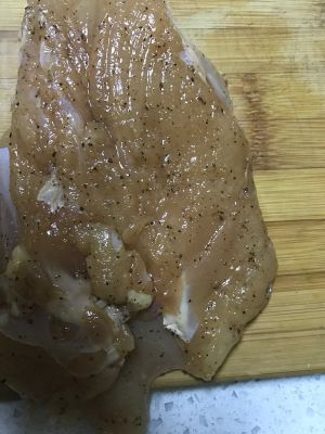将超市里买的鸡胸肉片成两个薄片,用刀背分别将鸡肉拍松散,加入适量盐、白糖、料酒、番茄酱、洋葱碎、黑胡椒碎进行腌制,最好腌制一个小时以上。