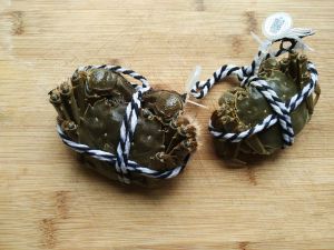 将蟹逐只洗净,放入水中养半天,使其排净腹中污物,然后用细绳将蟹钳、蟹脚扎牢;