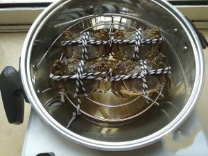 水开了,上锅蒸15分钟即可,肚皮向上哦,以免蟹黄等流出来!