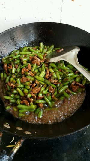 瘦肉切丝,豆角洗净掰段,花生油下大料烧热,葱姜蒜炝锅,下肉丝炒,放料酒,放老抽生抽,炒一下,放豆角炒。