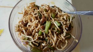 锅中再放油,油热后倒入豆芽和青菜,大火煸炒30秒。