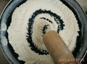 用木锅铲(别的也可以,我用的擀面杖)翻炒。炒至微微发黄就可以出锅了。