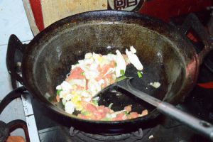 继续在锅内放葱姜爆香,放入西红柿翻炒,然后放少量水,水千万别太多阿,这是炒面