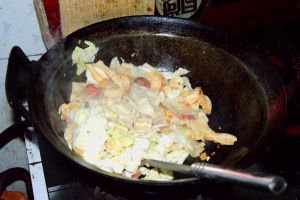 放入油好花生油将红萝卜丝,包菜,韭黄,蒜末,葱爆炒1分钟。