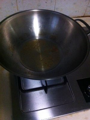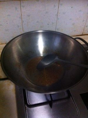 换锅,继续干炒,将多余的油倒出来。炒至肉块成缩水状