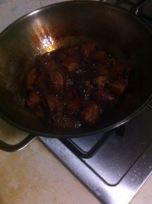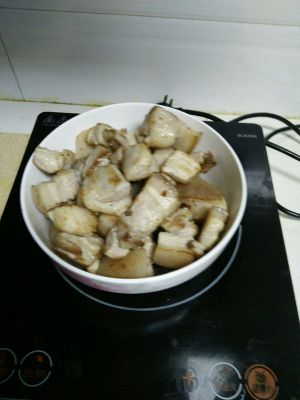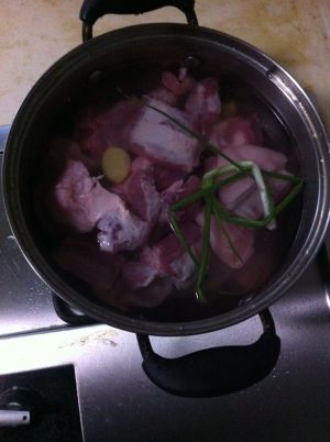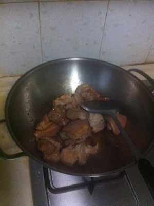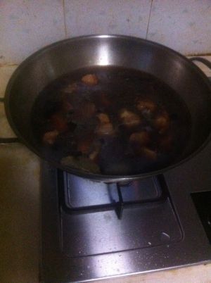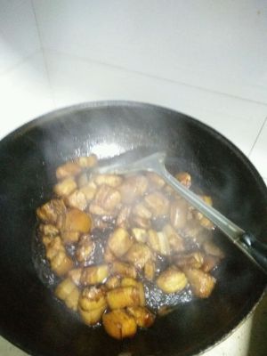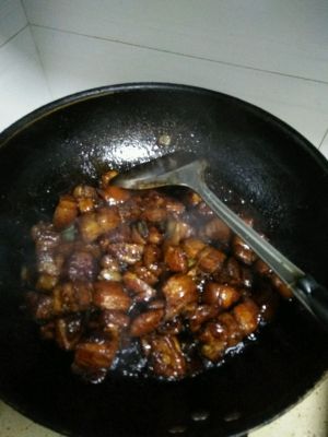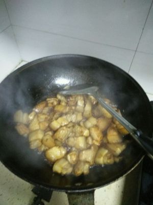 再拿一个不粘锅,里面倒入黄酒,放入姜片,煮开放入五花肉,加老抽,大火煮开换小火炖1个小时《炖一会放入冰糖》肉快熟了,汤会很粘稠,多搅拌,不然会糊底,出锅撒入鸡精。