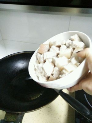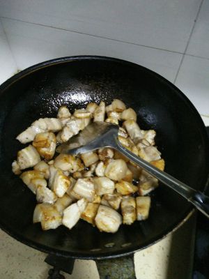 把锅烧热,放少许的食用油,以免粘锅。在锅中开回翻炒。翻炒至肉块出油,但不要炒糊了或者干掉。