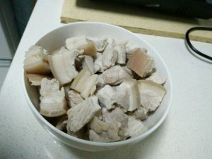 把带皮五花肉切成小方块,用开水绰一下去除血沫,一到两分钟即可。