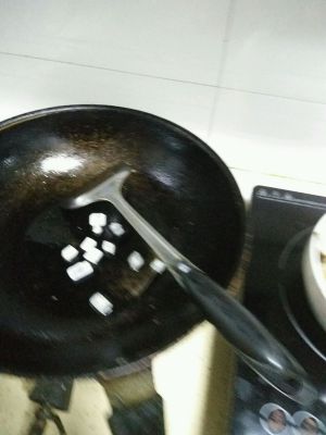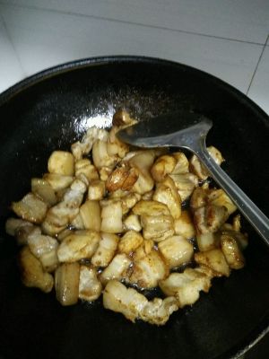 将炒好的肉块铲出来,锅中的油仍然留在锅内,放入几块冰糖。(白糖代替也可以,我的冰糖就有些放多了,建议放4小块就够了)。