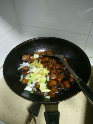 放生抽,老抽,姜片,八角,葱段,继续翻炒,加入适量热水,开大火。
