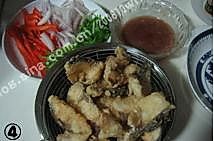 起油锅,将腌制好的鱼片沾裹上生粉后,下油锅炸至酥香金黄捞出控油备用;