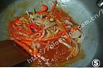锅内注少许油,下甜椒丝、洋葱片及香菜梗,略加煸炒后,倒入4中的烹饪味汁,大火煮开;