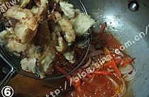 淀粉放在一个大碗里,加少许水,只要能和开即好,把鱼两面都摸上淀粉糊,锅中做油,烧制六成热,把鱼提着尾巴放在油锅上,先用勺子把油浇到鱼身上,看鱼有点定型再放入油锅内