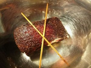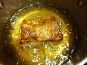 取出,擦干净水份,油烧到五成热,小火,放入肉块,肉片向下时最好放两根木棍在锅底,这样肉片不会沾锅