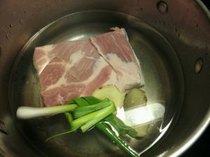 锅内煮开水,加入葱姜和绍兴酒,放入五花肉川烫熄火,让肉泡一会儿。