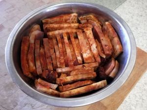 去皮后, 切成和五花肉一样厚度、大小的片状。 交代一下: 其余没有出境的边角料, 有被蒸了蘸白糖吃, 也有被切丁烧汤吃