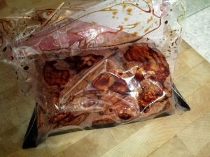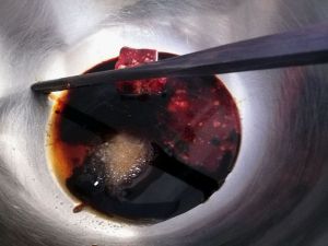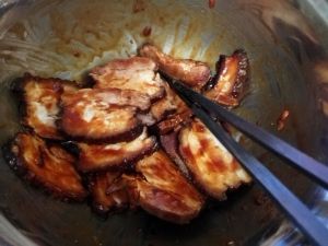 腌肉的老抽少许,加一块南乳,少许南乳汁,砂糖,蚝油拌匀,