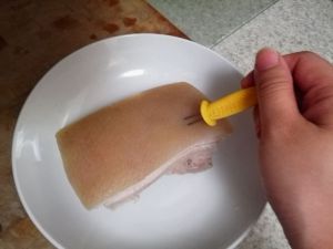 取出来,擦干净水份,在皮上密集扎上孔,这对之后猪皮起皱很重要