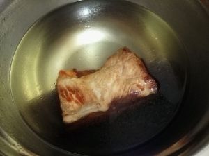 用少量油,把猪皮朝下,小火把猪皮煎到焦黄(注意盖上锅盖,以免被炸出来的油伤到)。