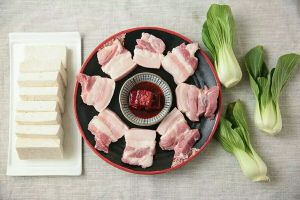 带皮五花肉清水加料酒煮30分钟,然后泡冷水5分钟里面。