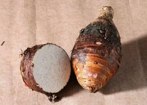 个头大,肉色白, 质地松软的都是好槟榔芋。 切开后, 可以看到上面布满了细小的红筋。