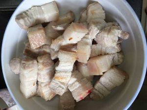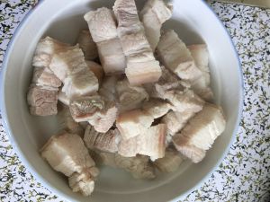 新鲜五花肉切块加生抽2瓷勺,老抽1瓷勺,耗油1瓷勺,料酒2瓷钱腌制30分钟以上。(时间允许的话,可以包上保鲜膜放冰箱冷藏过夜)