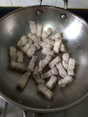 五花肉放入锅中煸炒,表面变金黄色为止。