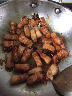 放入五花肉翻炒,迅速上色。加入生姜、蒜、红辣椒、老抽、花椒等。