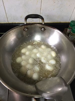 倒入大量油,加入鹌鹑蛋。炸成金黄色为止。