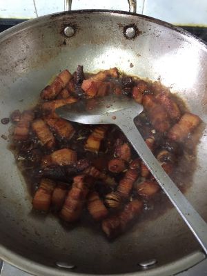 熬成糖浆以后倒入五花肉翻炒,倒入生抽上色。