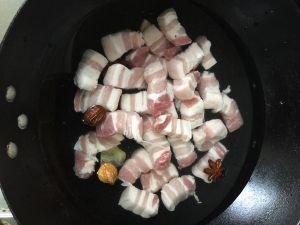 红烧肉切块洗净,冷水下锅煮。锅内放入姜片,八角,桂皮,料酒。