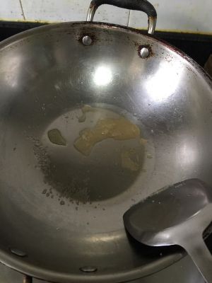 炒出油后中间放五勺白糖,糖溶化后再翻炒