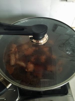 我是换了一个炖锅炖的,也可以直接在炒锅里炖,然后网锅里加入水,生抽,老抽,料酒和少量白酒,量根据自己的肉来