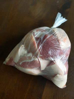 带皮五花肉 大约550g 收拾完切成5cm大小 我是一早收拾的 所以清洗完切完放到保鲜袋了
