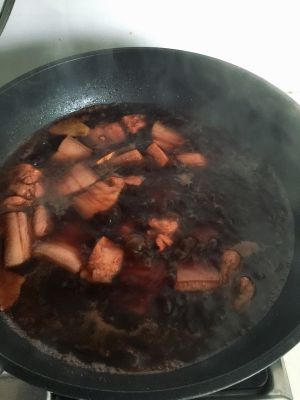 均匀上色后煎2分钟,加水,淹没4分之三,大火烧开。等水仅淹3分之2处时转小火熬。