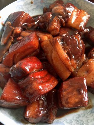 特别软糯 可以说入口即化 也没有再额外放油 猪肉的油性已经很大 所以就不要再放了 肉体保持的完整 因为整个过程没有翻动过肉 如果不停翻动 肥肉部分可能会烂掉