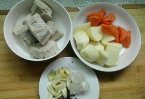 五花肉切成方块,红萝卜,土豆滚刀切块,姜,蒜切片,准备一块冰糖。