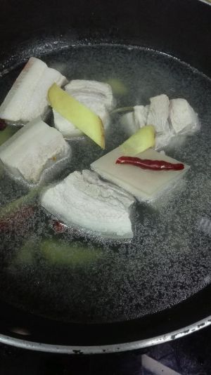 五花肉洗净,放入锅中,倒进没过猪肉的冷水,大火烧开,让肉肉紧出血沫后捞出;然后把五花肉切成小块