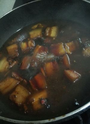 加入海天老抽酱油,海天的酱油易上色,不要加多,然后加入开水没过红烧肉,中火煮,期间要注意不要煮干了,等水煮干了再加水,煮3次应该就差不多了,大概20分钟左右。尝一下如果甜味不够可以加点冰糖,也可以适当放点盐。