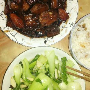 配上一碟蒜蓉青菜,主食葡萄干香米饭。