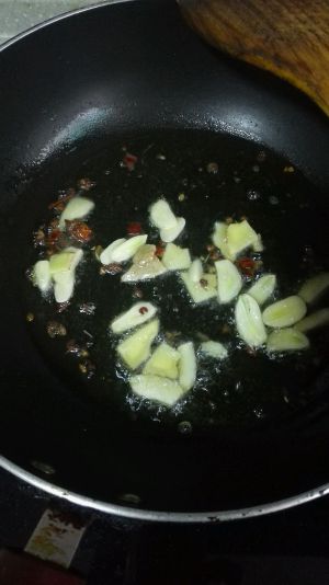 煎出油、肉肉呈现金黄色时,改大火,放入葱、姜、蒜、八角爆香;