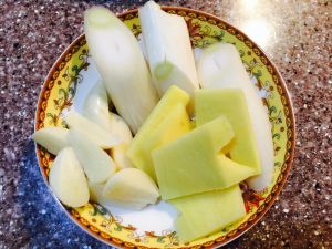 1/3的大蒜用刀轻轻拍一下裂开就行了,大葱切段、姜切片备用,猪肉连皮一起切成3厘米乘5厘米的长方块备用。