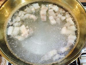 冷水下锅把五花肉煮至变色就可以捞出来了一定要记住煮的时候不要把锅盖盖上。