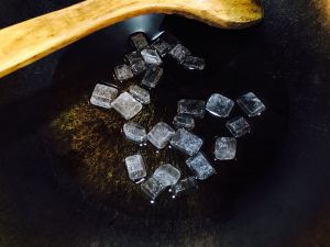 炒锅中加入50克白砂糖,大火干锅化糖,熬至砂糖完全融化,成蜂蜜色,继续加热至起泡;